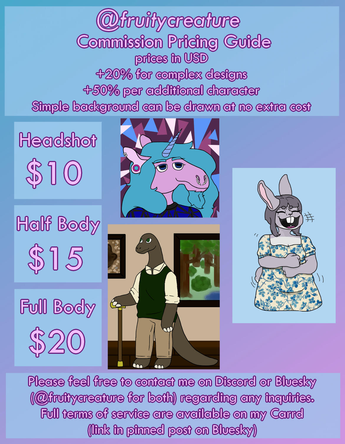 - I reserve the right to refuse a commission for any reason.- Payment will be accepted via PayPal invoice.- Work will not be started until payment is received.- Refunds will not be accepted once work has been started.- I retain full rights to any art I create.- You may not claim the art as your own and credit me when applicable.- You may not use my art to train AI.- You may not edit, trace, or draw over my art yourself.- You give me the right to post any art I’ve completed for you unless you explicitly state you do not want it published.- You acknowledge that you are willing to pay the stated price for my commissions.